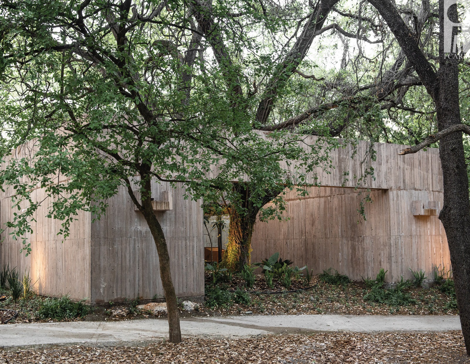 “La capilla se emplaza en un claro del bosque, donde dos muros paralelos definen una huella rectangular al centro de los dos núcleos más importantes de árboles. Dos volúmenes adicionales, para la bodega y sacristía, definen el patio del altar, enmarcando vistas donde la vegetación es protagonista”.