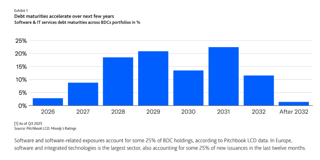 El riesgo de refinanciación también aumenta, especialmente en sectores como software y servicios de TI. Estos enfrentan presión por la inflación y la disrupción tecnológica impulsada por la inteligencia artificial.