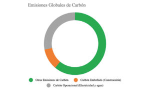 Un gráfico de dona que ilustra las emisiones globales de carbono subraya la magnitud del desafío ambiental actual. La mayor proporción, representada en verde, corresponde a otras fuentes de emisiones; el gris indica el carbono operativo asociado al uso y mantenimiento de los edificios; mientras que la fracción más pequeña, en naranja, representa el carbono incorporado en los materiales de construcción. Esta visualización pone en evidencia la necesidad de adoptar soluciones innovadoras y sustentables—como la madera estructural—en proyectos inmobiliarios premium. Integrar materiales con baja huella ambiental no solo responde a estándares internacionales y demandas regulatorias crecientes, sino que añade valor tangible inversores para exigentes y compradores que buscan propiedades alineadas con un futuro responsable y cómodo.