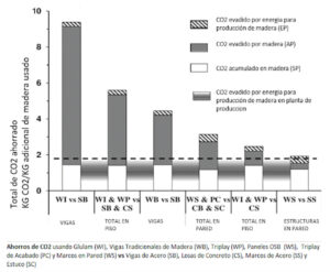 Según un artículo de The Conversation (2014), “Los 3.400 millones de metros cúbicos de madera que se recogen cada año representan sólo el 20% del nuevo crecimiento anual. Aumentar la cosecha de madera al 34% o más tendría varios efectos profundos y positivos. Se evitarían emisiones por valor del 14-31% del CO2 mundial creando menos acero y hormigón, y almacenando CO2 en la estructura celular de los productos de madera”. Cabe recalcar que, además del almacenamiento de carbono, la madera tiene propiedades aislantes que mejoran la eficiencia energética de los edificios, disminuyendo la necesidad de calefacción y refrigeración y reduciendo aún más las emisiones de carbono. Reemplazar materiales convencionales como el concreto y el acero con madera puede evitar considerables emisiones de gases contaminantes y eficientizar la operación del edificio.