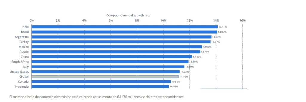 India, Brasil y Argentina encabezan el crecimiento del e-commerce retail entre 2023 y 2027, con tasas superiores al 13%. México aparece en quinto lugar con 12.93%, superando incluso a economías como China y Rusia.