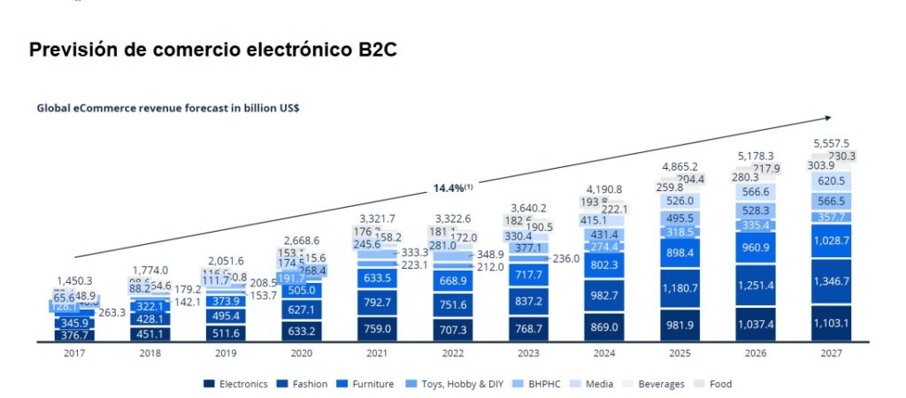 Dato clave: El e-commerce global alcanzará más de 36 billones de dólares en 2026, con crecimiento sostenido en B2B de 3 a 4 puntos porcentuales anuales desde la pandemia.