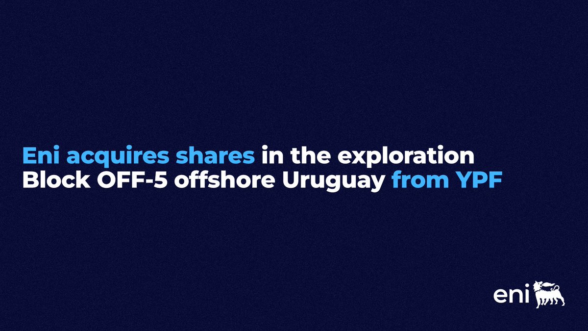 Eni ha firmado un acuerdo para adquirir el 50% de participación y la operación del Bloque de exploración OFF-5 en la costa de Uruguay de YPF. El acuerdo se hará efectivo tras la aprobación de las autoridades uruguayas.