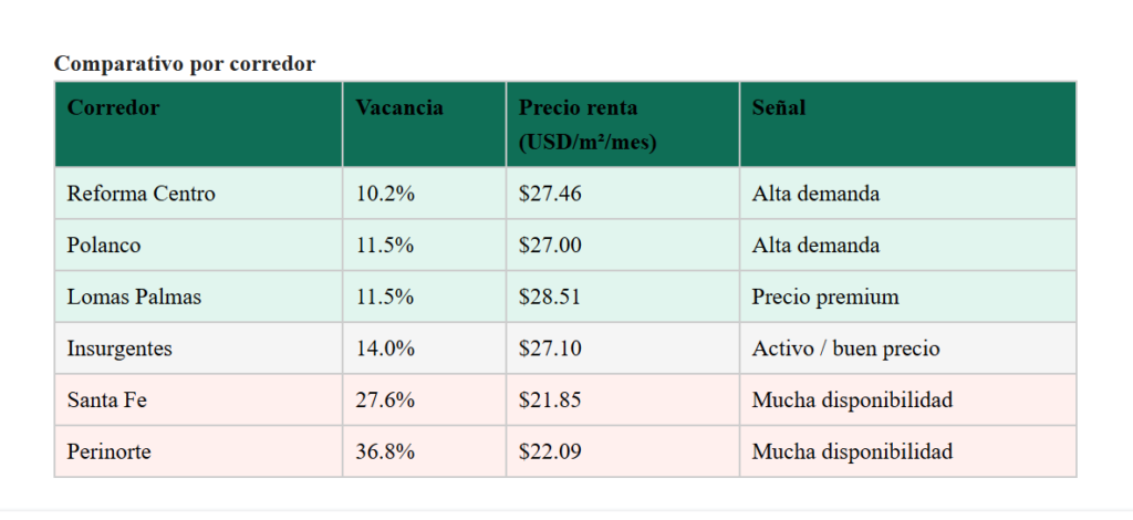 Reforma Centro, Polanco y Lomas Palmas destacan por su alta demanda, baja vacancia y precios elevados. Son mercados consolidados donde los espacios disponibles se absorben rápidamente.