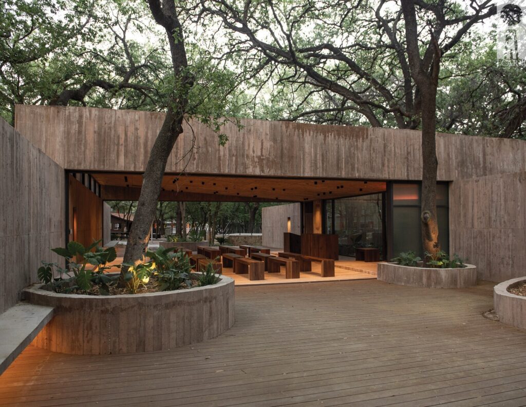 Por su parte, el interior se diseñó para conectar con los atrios exteriores a través de paneles corredizos de cristal acanalado que se ocultan por completo.