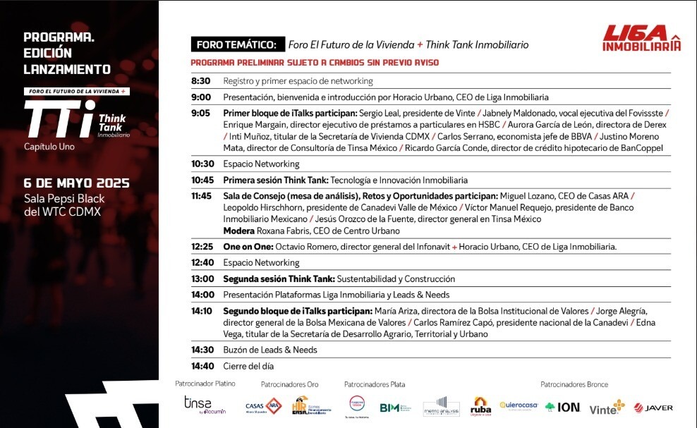 Liga Inmobiliaria combina dos formatos; primero, el Foro sobre el futuro de la vivienda, un espacio de diálogo donde líderes del sector abordarán los principales desafíos y oportunidades en tecnología, financiamiento, sostenibilidad y desarrollo inmobiliario. Por ello, incluirá conferencias al estilo TED, mesas de análisis con líderes del sector y encuentros exclusivos One-on-One entre inversionistas y figuras clave.
