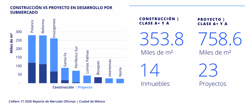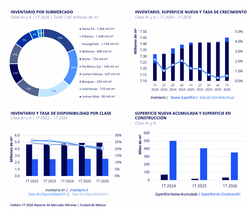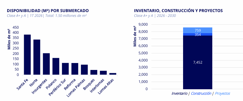 El mercado mantiene 1.50 millones de m² disponibles, pero concentrados en ciertos corredores. Santa Fe y Norte acumulan grandes volúmenes vacantes, mientras Polanco y Reforma operan con disponibilidad mucho menor .