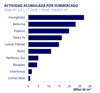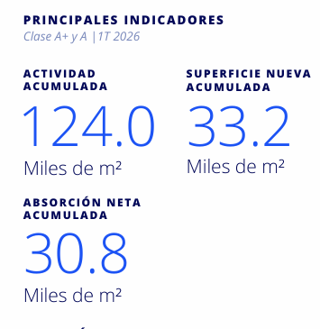 Durante el 1T 2026, la absorción neta fue de 30,816 m², una caída relevante frente a los 52,682 m² del mismo periodo de 2025 . La actividad total también retrocedió 11% anual.