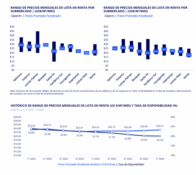 El precio promedio subió a 23.31 USD/m²/mes, con incrementos marginales respecto a 2025 .