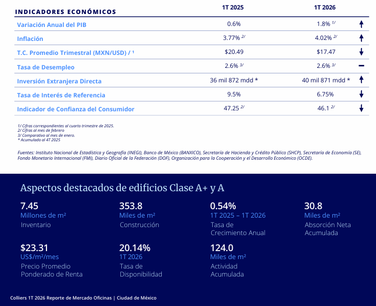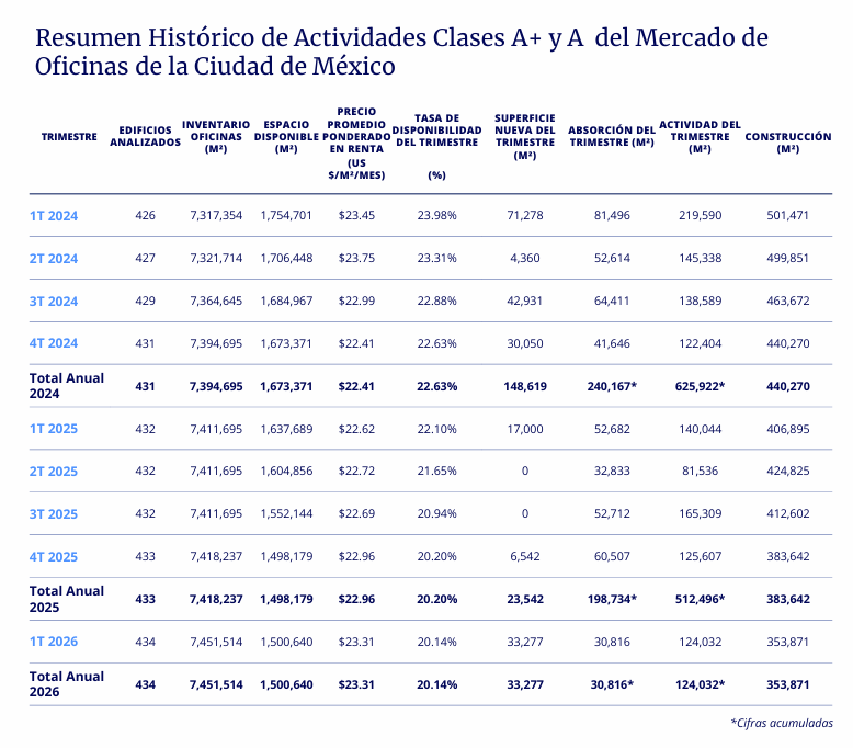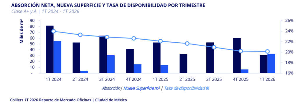 El mercado corporativo de la Ciudad de México inicia 2026 con señales de estabilización, pero lejos de una recuperación estructural. La absorción neta se mantiene positiva, aunque desacelerándose, mientras la disponibilidad sigue en niveles elevados y la nueva oferta se contrae.