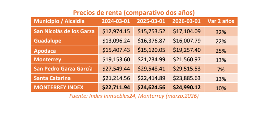 Por ejemplo, San Pedro Garza García registra rentas cercanas a $30,000 pesos mensuales. En contraste, Guadalupe muestra precios alrededor de $16,000 pesos.