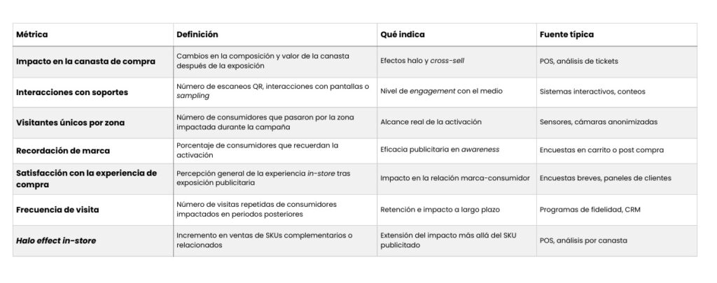 Entre las métricas consideradas aparecen tasa de conversión en tienda, dwell time en zona, redención de cupones, ticket promedio post exposición, ventas incrementales, share de marca contra categoría y GMROI.